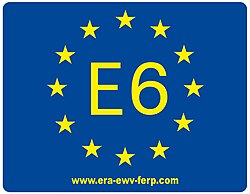 | Zeichen des Europäischen Fernwanderwegs E6 | Markierung der E-Wege | Europäische Wandervereinigung | Datei:E 6 sign.jpg | |