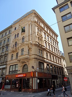 Das späthistoristische Wohn- und Geschäftshaus an der Ecke zur Wipplingerstraße wurde 1895 von Franz Xaver Neumann dem Jüngeren im altdeutschen Stil errichtet. Die zweigeschoßige Sockelzone ist genutet und als Geschäftszone ausgestaltet. Die ebenfalls genutete und durch verkröpfte Kordongesimse abgesetzte Hauptzone präsentiert sich üppig ausgestaltet. An der Seite zur Wipplingerstraße befindet sich ein dreigeschoßiger Erker mit lebensgroßen Karyatiden. Die von Kolossalpilastern gerahmten Eckachsen sind mit übergiebelten Fenstergruppen und Balkonen reich dekoriert. Am ebenfalls reich dekorierten Attikageschoß ist ein rosettenbesetztes Konsolkranzgesims zu sehen. Das toskanische Rundbogenportal ist mit Pilasten gerahmt und weist eine gerade Verdachung mit Triglyphenfries auf; die Gittertüre ist aufwändig gestaltet.