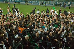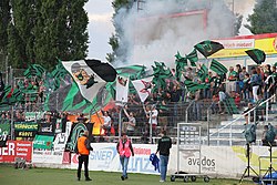 | celebration of FC Wacker Innsbruck fans after winning the match against RB Salzburg Juniors. Location: Waldstadion, Pasching, Upper Austria, Austria Camera: Nikon D2X Lens: 24-70mm F2,8 EX DG Focal Length: 70 mm Exposure: 1/320 sec, f/2,8 Film / Speed: ISO 800 Comment: | Eigenes Werk | Quellenangabe und Beleg an kulac gmx.at erbeten. | Datei:FC Wacker Innsbruck-RB Salzburg Juniors pasching 2010 01.jpg | |