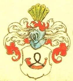 Wappenerklärung: Das Wappen wurde nach einem Beschluss des Geschlechtsverbandes vom 11. Oktober 1930 als einheitliches Wappen angenommen. (Vorher variierten die Abbildungen, die Schallöffnung des Horns war mal rechts- mal linksgerichtet, mal ohne, mal mit (schwarzen) Beschlägen und Schnur dargestellt; auf dem Helm wurden statt der Reiher- auch Pfauenfedern gezeigt und teilweise fiel dort das Horn als Helmzier weg.)