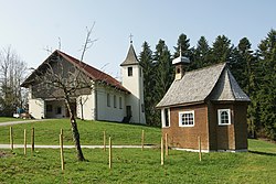 | 1934 erbaut: alte Fatimakapelle neben der Kapelle zu Unserer Lieben Frau von Fatima auf dem Stollen auf am Geserberg in Langen bei Bregenz . Die neue Kapelle wurde 1951/52 erbaut nach Plänen von Willibald Braun . | Eigenes Werk | böhringer friedrich | Datei:Alte Neue Fatimakapelle Stollen.JPG | |