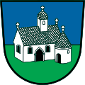 - „In von Blau und grün geteiltem Schild eine steinplattengedeckte silberne Kirche mit Turm über dem Chorquadrat und skulptiertem Portal längsseits; vor dem Chorschluss ein runder silberner Karner mit Kegeldach.“ [23]