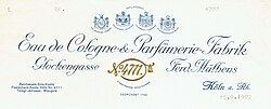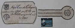 | Etikett entworfen von Ferdinand Mülhens 1881 mit späteren Blau Gold Zusatzetikett. | Farina Archiv | Ferdinand Mülhens | Datei:1882-Etikett4711.jpg | |
