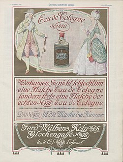 4711, die historische Kölner Hausnummer, rückte in den Mittelpunkt der Werbung und wurde schließlich zu einer Marke mit hohem Wiedererkennungswert. Gegen Ende des 19. Jahrhunderts entwickelte sich 4711 Echt Kölnisch Wasser zu einem Massenprodukt. 1873 erhielt Mülhens die Erlaubnis, das königliche Wappen der Niederlande zu führen. Auf Grund der hohen Qualität seiner Produkte wurde Ferdinand Mülhens um 1900 der Titel eines k.u.k. Hoflieferanten verliehen. 1902 erfolgte die Titelverleihung des Schahs von Persien, 1906 von der Königin-Mutter Margarethe von Italien, 1897 bzw. 1913 vom Zar von Russland und 1911 vom König von Rumänien.[2]