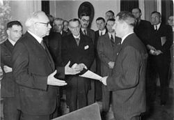 | Es folgt die historische Originalbeschreibung , die das Bundesarchiv aus dokumentarischen Gründen übernommen hat. Diese kann allerdings fehlerhaft, tendenziös, überholt oder politisch extrem sein. Diese Beschreibung ist tendenziös oder falsch: Die Bildbeschreibung stellt den Massenmord der Sowjets im Katyner Wald an kriegsgefangenen Polen als faschistische Propaganda dar, tatsächlich sei das Kriegsverbrechen "von den Faschisten selbst" ausgeübt worden. Die Bildbeschreibung ist ein Beispiel für ostdeutsche und sowjetische Geschichtsschreibung. Auch in den Schulen wurde der Massenmord von Katyn bis zum Ende der DDR und der Sowjetunion als nationalsozialistisches deutsches Verbrechen umgedeutet. Zentralbild II. Weltkrieg 1939 - 45 Im April 1943 starten die deutschen Faschisten die antisowjetische Propaganda über den Massenmord im Katyner Wald, 15 klm nw. von Smolensk, wo sie Massengräber mit ca. 11 000 ermordeten kriegsgefangenen Polen als Greueltaten der Sowjets erklärten. ( Die Außerordentliche Staatliche Kommission unter Leitung des Akademikers Burdenko stellte in ihrem Untersuchungsbericht vom 24.01.1944 fest, dass die Ermordungen nicht wie die Faschisten behauptet hatten, im Frühjahr 1940 sondern erst im Herbst 1941, also von den Faschisten selbst, stattgefunden haben.) UBz: die Mediziner aus ganz Europa, die auf Einladung des Reichsgesundheitsführers Dr. Conti die Massengräber im Wald von Katyn besichtigt haben, überreichen durch Prof. Dr. Orsós , Budapest, bei dem Empfang in Berlin, Dr. Conti Leonardo (rechts) das Protokoll ihrer Feststellungen. In der Mitte Speleers, Professor der Universität Gent 1 4. Mai 1943 | Dieses Bild wurde im Rahmen einer Kooperation zwischen dem deutschen Bundesarchiv und Wikimedia Deutschland aus dem deutschen Bundesarchiv für Wikimedia Commons zur Verfügung gestellt. Das deutsche Bundesarchiv gewährleistet eine authentische Bildüberlieferung nur durch die Originale (Negative und/oder Positive), bzw. die Digitalisate der Originale im Rahmen des Digitalen Bildarchivs . | Autor/-in unbekannt Unknown author | Datei:Bundesarchiv Bild 183-J14110, Katyn, Öffnung der Massengräber, Abschlussbericht.jpg | |