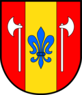 - „In Rot ein goldener, mit einer blauen heraldischen Lilie belegter Pfahl, vorne und hinten je eine silberne, mit der Schneide nach außen gewandte Streitaxt.“