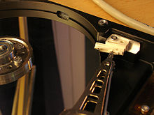 Ein Festplattenlaufwerk (englischhard disk drive, Abkürzung HDD), früher auch Festplatten-Speichersystem oder Festplatten-System[1], oft auch als Festplatte oder Hard Disk (abgekürzt HD) bezeichnet, ist ein magnetischesSpeichermedium der Computertechnik, bei welchem Daten auf die Oberfläche rotierender Scheiben (auch englisch „Platter“ genannt) geschrieben werden. Zum Schreiben wird die hartmagnetische Beschichtung der Scheibenoberfläche entsprechend der aufzuzeichnenden Information berührungslos magnetisiert. Durch die Remanenz (verbleibende Magnetisierung) erfolgt das Speichern der Information. Das Lesen der Information erfolgt durch berührungsloses Abtasten der Magnetisierung der Plattenoberfläche.