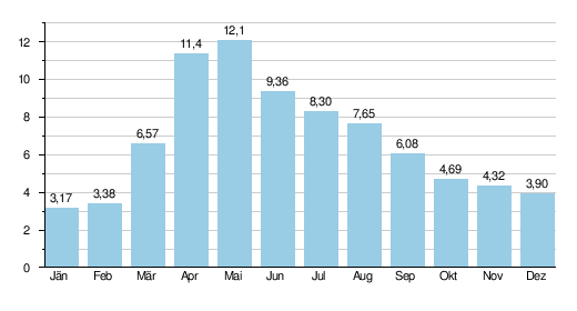 Mittlere monatliche Abflüsse der Fieberbrunner Ache (MQ in m³/s) am Pegel Almdorf