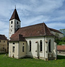 Der mittelgroße Kirchenbau ist einschiffig. Im Grundriss ist die ursprüngliche gotische Anlage, die um 1400 errichtet und 1405 erstmals urkundlich erwähnt wurde, gut erhalten. Der Bau besteht großteils aus vermörteltem Bruchsteinmauerwerk, nur wenige Teile sind aus Ziegeln gemauert.[1] Der Chor besitzt die gleiche Breite und Höhe wie das Kirchenschiff und einen 5/8-Schluss. Die zweistufigen Strebepfeiler des Chors lassen darauf schließen, dass er von Beginn an eingewölbt war. Die Fenster sind groß und spitzbogig; zum Teil sind sie noch zweibahnig; innen sind sie rechteckig verändert.[2]