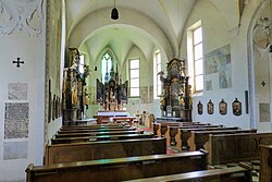 Das Langhaus ist dreijochig und besitzt über Konsolen ein Kreuzgratgewölbe.[2] In der westlichen Hälfte des Schiffes befindet sich an der Nord- und Südmauer je ein gotisches Tor mit profiliertem Gewände. Das südliche ist vermauert, das Bogenrelief mit dem Lamm Gottes aus dem 15. Jahrhundert blieb sichtbar. Neben dem nördlichen Tor befindet sich ein steinerner Weihwasserkessel, bezeichnet 1511. Die Fenster sind innen rechteckig abgeschlossen, diese barockisierende Änderung fand 1623 bis 1625 unter Abt Hieronymus Marchstaller statt. In dieser Zeit wurde auch an der Westseite eine Sängerempore errichtet, die über eine Wendeltreppe aus Holz erreichbar ist. An den beiden Balustersäulen, die das Gewölbe der Empore tragen, sind die Jahreszahl 1624 und H.A.S.P. zu lesen. Unter Marchstaller wurden auch Chor und Langhaus (neu) eingewölbt, der Boden wurde um rund 63 cm angehoben. Dadurch kam es zu einer deutlichen Veränderung des Raumeindrucks. Ein Maler, vermutlich Lorenz Gabler, malte die Gewölbe aus. Diese wurden wohl bei der Restaurierung 1864 übertüncht. Damals entstand das Deckengemälde in neuraffaelischem Stil, das drei singende Engel zeigt.