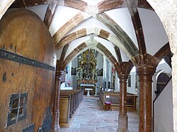 Das dreijochige – im Kern romanische – Langhaus hatte ursprünglich eine Flachdecke, deren Reste über dem heutigen Gewölbe noch erkennbar sind. Das Langhaus wurde mit einem spätgotischen Vierrautensterngewölbe auf Wandpfeilern sowie vorgelagerten Runddiensten mit Basis- und Rundkapitell und schildförmigen Schlusssteinen überwölbt. Der spitzbogige Triumphbogen ist abgefast. Der spätgotische zweijochige Chor mit Fünfachtelschluss hat die Gewölbekonfiguration des Langhauses. Das Sakristeiportal mit Türe ist aus der 2. Hälfte des 17. Jahrhunderts. Die Sakristei mit einer Flachdecke beinhaltet die Treppe zur Kanzel.