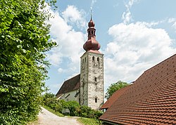 Die Kirche wird von einer vollständig erhaltenen Kirchhofmauer mit zwei Rundbogentoren umgeben. An ihrer Westseite steht der 1658 vom Maurermeister Blasius Sorger errichtete Kirchturm mit einer 1680 aufgesetzten Zwiebelhaube mit Laterne sowie einer im 15. Jahrhundert gegossenen Glocke. An allen Seiten des Kirchengebäudes befinden sich abgetreppte Strebepfeiler, wobei einer im Südwesten das Datum 1525 zeigt. Die zweibahnigen Maßwerkfenster aus der Bauzeit sind bis heute großteils erhalten. Ein verstäbtes Spitzbogenportal mit schulterbogigen Sturz und einem hohen Tympanonfeld an der Südseite führt in den Innenraum.[2]