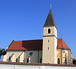 Der Bau stammt aus der zweiten Hälfte des 15. Jahrhunderts mit einer westlichen Verlängerung des Langhauses um drei Joche von 1890. Den Chor stützen dreistufige Strebepfeiler. Im Süden schließt der gotische Kirchturm mit Pyramidendach an den Chor. Die Sakristei wurde im 19. Jahrhundert im Norden an den Chor angebaut.