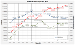 Seit der EU-Erweiterung 2004 sind die Passagierzahlen und auch die Frachtmengen stark angestiegen; der Flughafen ist logistisches Zentrum vieler Unternehmen, die von hier aus den gesamten Raum des früheren Ostblocks bedienen. Der Flughafen hat sich außerdem zu einem Luftfahrt-Drehkreuz nach Osteuropa, den Nahen und Mittleren Osten sowie für Langstreckenflüge entwickelt. So bedient Korean Air seit dem 15. September 2007 Seoul-Incheon dreimal wöchentlich mit einem Direktflug. Im Jahr 2016 wurden 34 Ziele in Osteuropa direkt angeflogen (zum Vergleich: In Frankfurt waren es 30).[19] Außerdem ist die Präsenz vieler Billigfluggesellschaften gestiegen. Seit 2007 fliegt beispielsweise die britische Fluggesellschaft easyJet Wien an. Sie gründete am 18. Juli 2017 ein österreichisches Tochterunternehmen namens easyJet Europe, das wenige Tage später den Flugbetrieb aufnahm.