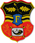 Blasonierung: „Geteilt; blaues Herzschildchen mit goldenem Antiqua-Versalbuchstaben F; oben in Schwarz über goldenem Zwillings-Wellenbalken ein goldener, querliegender Eichenast mit zwei Blättern und einer aufrechten Eichel; unten in Rot ein silberner Polster mit goldenen Quasten an den vier Ecken und darauf liegendem schwarzen, goldverzierten Posthorn mit schwarzer, kreuzweise verschlungener Schnur.“[8]