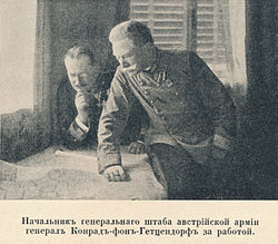 Als Generalstabschef entwickelte Conrad detaillierte Operationspläne gegen die potentiellen Gegner Russland, Serbien und Italien, die sich zu Kriegsbeginn 1914 allesamt als Makulatur herausstellten.[30] Er gehörte mit den wichtigsten Exponenten der Gesamtmonarchie, dem k.u.k. Außenminister Leopold Berchtold, dem österreichischen Ministerpräsidenten Karl Stürgkh, dem gemeinsamen Finanzminister Leon Biliński und dem k.u.k. Kriegsminister Alexander von Krobatin zur so genannten Kriegspartei, den Befürwortern einer kriegerischen Auseinandersetzung mit Serbien.[31] Der Historiker Wolfram Dornik hat ihn deshalb auch als Falken des Kaisers bezeichnet.[32]