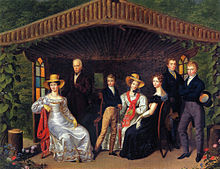 | Familienbild des Kaiserhauses um den Herzog von Reichstadt (1826, Leopold Fertbauer). Von links nach rechts: Karoline Auguste von Bayern , Kaiserin von Österreich; Franz I. , Kaiser von Österreich; Napoleon Franz Bonaparte , Herzog von Reichstadt; Sophie Friederike von Bayern , Erzherzogin von Österreich; Marie-Louise von Österreich , Herzogin von Parma, Piacenza und Guastalla; Ferdinand I. von Österreich und Franz Karl von Österreich . | Hans Ottomeyer et al., Biedermeier: The Invention of Simplicity (Ostfildern: Hatje Cantz, 2006). Uploaded by James Steakley | Leopold Fertbauer (1802-1875) | Datei:Die kaiserliche Familie um den Herzog von Reichstadt in einer Gartenlaube.jpg | |