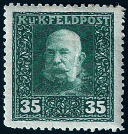 | Kaiser Franz Joseph, Österreich-ungarische Kaiserliche und Königliche Feldpost, Michel-Nr. 35 A vom 01.07.1915, | von mir selbst gescannte Briefmarke | Österreichisch-ungarische Kaiserliche und Königliche Feldpost (1915) | Datei:520108387.gif | |