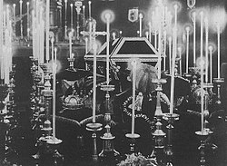 | Aufbahrung des Sarges Kaiser Franz Josephs in der Hofburgkapelle Wien | selbst fotografiert von Ansichtskarte | ViennaUK | Datei:FranzJosephSargHofburgkapelleWien.jpg |