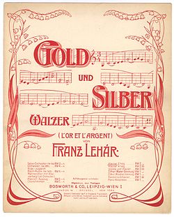 | Franz Lehár (1870–1948): Gold und Silber op. 79, Walzer für Orchester (1902) Titelblatt; Musikverlag Bosworth & Co, Wien | Collection Walter Anton | graphic design: unknown; scan: Walter Anton | Datei:Franz Lehar Gold und Silber Walzer op 79.jpg | |