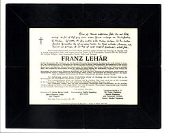 | Todesanzeige für Franz Lehár; darauf in dessen Handschrift: Wenn ich Musik geschrieben habe die ins Volk dringt so hab ich doch ganz einen andern Zweck verfolgt als Unterhaltung zu bieten. Ich wollte ihr Herz erobern in ihre Seelen dringen und die vielen hundert Zuschriften die ich aus allen Teilen der Welt erhalte, beweisen mir, dass es mir gelungen ist und dass ich nicht umsonst gearbeitet, gelebt habe. (Anton Lehár ließ den Absatz in Faksimile auf die Anzeige setzen.) | collections of Walter Anton | Autor/-in unbekannt Unknown author | Datei:Franz Lehar death notice.jpg | |