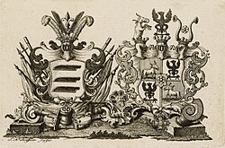 | Wappen des Franz Maximilian Jahnus von Eberstädt und seiner zweiten Frau Christiane Dorothea, geb. von Auersperg (1721–1804)abgebildet:Jahnus von Eberstädt, Franz Maximilian | Staats- und Universitätsbibliothek Hamburg | Franz Nikolaus Rolffsen | Datei:PPN66395648X Wappen des Franz Maximilian Jahnus von Eberstädt (1765).jpg |