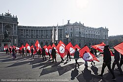 | Für die Performance HELDENPLATZ / ANARCHIE marschiert Franz Wassermann gemeinsam mit 49 FahnenträgerInnen auf dem Heldenplatz in Wien auf. Die eigens für die Performance entwickelten Fahnen erinnern an die Fahnen der NationalsozialistInnen, zeigen aber an der Stelle, wo in der historischen Version ein Hakenkreuz sitzt, die Namen von Konzernen, Hedgefonds und Banken. Franz Wassermann: HELDENPLATZ / ANARCHIE, 2015 (Foto: Robert Fleischanderl) | Eigenes Werk | Mauheld | Datei:Franz Wassermann, HELDENPLATZ - ANARCHIE, 2015.jpg |