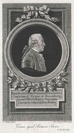 | Franz Xaver Wolfgang von Orsini-Rosenberg (1723-1796), Austrian diplomat | Wien, Österreichische Nationalbibliothek, Bildarchiv und Grafiksammlung, Porträtsammlung, Inventar-Nr. PORT_00013063_01, portraitindex.de | engraver: Jakob Adam (1748–1811) Alternative Namen Jakob Adam Beschreibung österreichischer Kupferstecher Geburts-/Todesdatum 9. Oktober 1748 16. September 1811 Geburts-/Todesort Wien Wien Wirkungsstätte Wien Normdatei : Q1678880 VIAF : 51959134 ISNI : 0000000109012671 ULAN : 500005832 GND : 122075560 LCCN : nr89015643 WorldCat artist QS:P170,Q1678880 „Jacob Adam sc. Vienne 1783“ drawing: „C. Vinazer fecit“ | Datei:Orsini-Rosenberg Franz Xaver.jpg |