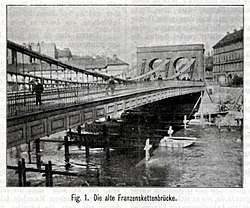 | Bild der alten Franzenskettenbrücke über den Donaukanal in Wien | Zeitschrift des Österreichischen Ingenieur- und Architekten-Vereins, Wien, 4. Mai 1900 | unbekannter Fotograf | Datei:GuentherZ Franzensbrücke (1844 – 1898) 0001.jpg | |