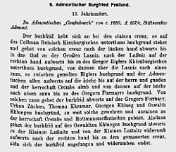 - ↑ Anton Mell: Hohe und niedere Strafgerichtsbarkeiten. Landgerichte und Burgfrieden in Steiermark. In: Anton Mell, Hans Pirchegger: Steirische Gerichtsbeschreibungen. Als Quellen zum Historischen Atlas der österreichischen Alpenländer. I. Abteilung. Landgerichtskarte: Steiermark. In der Reihe: Quellen zur Verfassungs- und Verwaltungsgeschichte der Steiermark. I. Band. Herausgegeben von der Historischen Landeskommission für Steiermark, Graz 1914. Allgemein: S. XX–XLIV. Zum Admonter Burgfried: S. 239.