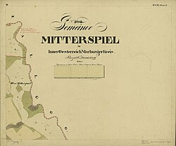 Das Gebiet von Ober Mitterspiel wurde 1891 von der damaligen Gemeinde abgetrennt und der Nachbargemeinde Kloster, Katastralgemeinde Klosterwinkel, angeschlossen. Gleichzeitig wurde das westliche Gebiet der Katastralgemeinde Hinterleiten, Ortsgemeinde Wildbach, der Gemeinde Mitterspiel zugefügt.[23] Flächen- und Einwohnerzahlen aus der Entstehungszeit der Gemeinde[24] und bis 1891 beziehen sich auf das ursprüngliche Gemeindegebiet. Die Grenzänderung wurde im Grundsteuerkataster (Franziszeischer Kataster) händisch nachgetragen: