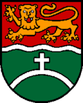 Blasonierung: Geteilt durch eine silberne Wellenleiste; oben in Rot ein goldener, schreitender, rot bezungter Leopard; unten in Grün ein silberner, schmaler Bogen, oben besteckt mit einem silbernen Kreuz.