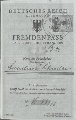 | Fremdenpass von de:Anneliese Landau , 1936, zusätzlich zum Vornamen musste sie den Namen Sara tragen, dieser wurde hier nachträglich eingetragen | Daniela Reinhold (Hrsg.): Von Berlin nach Los Angeles. Die Musikwissenschaftlerin Anneliese Landau. Hentrich & Hentrich Verlag, Berlin 2017, ISBN 978-3-95565-226-5 | Deutsches Reich | Datei:Anneliese Landauer Fremdenpass 1936.jpg |