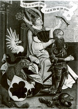 | Ulrich von Frundsberg als Stifter der Familienretabel eingescannt aus: Horst Carl: Der Schwäbische Bund 1488 - 1534; Landfrieden und Genossenschaft im Übergang von Spätmittelalter zur Reformation; Leinfelden-Echterdingen, 2000; ISDN 3-87181-424-5, S. 276 | Ulmer Museum, Ulm | Bernhard Strigel | Datei:276 Schwäbischer Bund Ulrich d.Ä. von Frundsberg.jpg | |