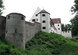 | Mindelburg; staufischer Herrschaftssitz, unter Herzog Friedrich von Teck um 1370 erweitert und unter den Herren von Frundsberg im späten 15. und frühen 16. Jahrhundert erneuert; Palas, viergeschossiger Satteldachbau mit Türmchen an der Nordseite und neugotischem Anbau an der Westseite, Fundamente 12. /13. Jahrhundert, im Kern um 1500, um 1670 erneuert, Umgestaltung 1878; Treppenturm und Verbindungstrakt, zwischen Hauptbau und Kapelle, 16. Jahrhundert, Turm um 1670; Schlosskapelle St Georg, Saalbau mit eingezogenem Chor, geschwungenem Giebel und Dachreiter mit Zwiebelhaube, im Kern 1370, Veränderungen 2. Hälfte 15. Jahrhundert, 1684 und 1718; mit Ausstattung; Reste des ehem. Westflügels, Ziegelmauer mit Stützpfeilern und stichbogigem Portal, bez. 1583; Fallturm, zylindrischer Turm mit Gurtgesimsen, Zinnenkranz und südlich angebautem Treppenturm, 1. Hälfte 16. Jahrhundert; Brunnen, gemauert, wohl Ende 15. Jahrhundert; Torhaus, ehem. Benefiziatenhaus, unregelmäßiger, dreigeschossiger, turmartiger Satteldachbau mit Blendarkaden, am Graben errichtet, frühes 16. Jahrhundert; Brücke und Futtermauern des Abschnittsgrabens, wohl frühes 16. Jahrhundert; Wohnhaus, zwei- bzw. dreigeschossiger Satteldachbau mit Fachwerkobergeschoss, Verbindungsbau zwischen äußerem Tor und Rundturm der Ringmauer, im Kern wohl 16. Jahrhundert; Burgschenke, wohl ehem. Torwächterhaus, dann Kornmesserhaus, zweigeschossiger Satteldachbau, im Kern 16./17. Jahrhundert, Veränderungen 18.-20. Jahrhundert; Ökonomiegebäude, erdgeschossiger Satteldachbau, 19. Jahrhundert; Äußeres Tor, viereckiger Torturm mit tonnengewölbter Durchfahrt und Satteldach, im Kern Ende 15./Anfang 16. Jahrhundert, Veränderungen 17./18. Jahrhundert; Barbakane, dem äußeren Tor vorgelagert, im Kern 15./16. Jahrhundert; Befestigungsanlage, Ringmauer mit Rondellen und Rundtürmen, um Haupt- und Vorburg angelegt, Ziegelmauerwerk, spätes 15./frühes 16. Jahrhundert | Eigenes Werk | Rufus46 | Datei:Mindelburg Mindelheim-5.jpg | |