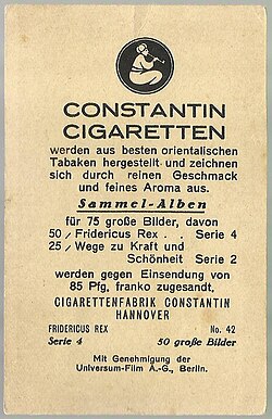 | Revers eines Sammelbildes beziehungsweise Zigarettenbildes der Cigarettenfabrik Constantin für das in Kooperation mit der mit der Universum Film AG ( UFA ) entstandenen Doppel-Albums für die beiden Kino-Filme „ Fridericus Rex “ und „ Wege zu Kraft und Schönheit “ das insgesamt 75 Bilder umfasste, davon 50 Bilder aus der Serie 4 zu Fridericus Rex (hier die Rückseite des Film-Fotos Nummer 42) sowie 25 Bilder aus der Serie 2 zu den Wegen zu Kraft und Schönheit. Unter dem Logo der Rauchwarenherstellerin, einem pfeifenrauchenden "Türken" mit Turban, die Werbung „Constantin Cigaretten werden aus besten orientalischen Tabaken hergestellt und zeichnen sich durch reinen Geschmack und feines Aroma aus.“ | Delcampe | Cigarettenfabrik Constantin in Kooperation mit der Universum Film AG ( UFA ) | Datei:1926 circa Constantin Cigaretten Zigarettenbild Fridericus Rex Serie 4 Nummer 42.jpg | |