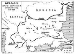 | Las fronteras de Bulgaria según el Tratado de San Stefano entre Rusia y el Imperio otomano y su correción por el posterior Congreso de Berlín, que creó el Principado de Bulgaria, autónomo dentro del Imperio, y la región semiautónoma de Rumelia Oriental dejando el resto de territorios en el Imperio. | Bulgaria-SanStefano_-(1878)-byTodorBozhinov.png | Bulgaria-SanStefano_-(1878)-byTodorBozhinov.png : Todor Bozhinov derivative work: Rowanwindwhistler ( talk ) | Datei:FronterasDeBulgariaSegúnSanStefanoYBerlín1878.svg | |