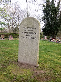 Der Gedenkstein für die Vertriebenen des Zweiten Weltkriegs ist ein übergroßer Grabstein mit der Inschrift Zum Gedenken der Opfer der Vertreibung in Folge des II. Weltkrieges.