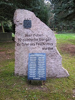 Für die Opfer des Faschismus wurde ein Gedenkstein aufgestellt. Die Inschrift lautet Hier ruhen 32 polnische Bürger die Opfer des Faschismus wurden. Die Namenstafel am Stein ist jüngeren Datums als der Gedenkstein und enthält die Inschrift Hier sind polnische Staatsbürger begraben, als Zwangsarbeiter vom NS-Regime zu Tode geschunden sowie die Namen der polnischen Bürger.