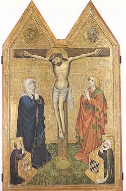 | Das Dreiflügel-Retabel zeigt auf der Mitteltafel die Kreuzigung mit Maria und hl. Johannes Evangelist label QS:Lit,"Crocifissione con Maria e San Giovanni Evangelista" label QS:Lfr,"Crucifixion avec Marie et Saint Jean Evangeliste" label QS:Lpl,"Ukrzyżowanie z Maryją i św. Janem Ewangelistą" label QS:Lnl,"Kruisiging met Maria en Johannes Evangelist" label QS:Lde,"Kreuzigung mit Maria und hl. Johannes Evangelist" label QS:Len,"Crucifixion with Saint Mary and Saint John Evangelist" label QS:Lmk,"Распетие со Богородица и Јован Богослов" label QS:Les,"Crucifixión con Maria e San Giovanni Evangelista" sowie die in Betstühlen knienden Stifter, auf den Flügeln innen die Heiligen Cäcilie und Valerian, auf den Außenseiten der Flügel die Verkündigung. Als zugehörig gelten zwei heute verschollene Standflügel mit den Heiligen Urban und Sigismund . Anhand der Entstehungszeit des Altars und der an den Betstühlen angebrachten Wappen von Zollern und Bayern sind die Stifter als Burggraf Friedrich VI. – als Kurfürst von Brandenburg Friedrich I. – und seine Gemahlin Elisabeth aus dem Haus Bayern-Landshut zu erkennen, zu deren Hauptresidenzen die Cadolzburg zählte. 1426 zog sich Friedrich I. hierhin zurück. 1850 machte der preußische Jurist und Geschichtsforscher Julius v. Minutoli das im Zuge seiner Forschungen über Friedrich I. wiederentdeckte Werk publik. Nach dessen Besichtigung 1873 und auf seinen dringenden Wunsch erhielt Kronprinz Friedrich (III.) , diesen als Geschenk. | Scan from Helmut Börsch-Supan: 450 Jahre Jagdschloss Grunewald 1542-1992 II. Aus der Gemäldesammlung, Staatliche Schlösser und Gärten Berlin 1992, p.9 | Meister des Cadolzburger Altars | Datei:Cadolzburger Altar - Mitteltafel - Jagdschloss Grunewald.jpg | |