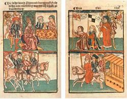 | Friedrich I. wird mit der Mark Brandenburg belehnt und wird zum Kurfürsten erhoben. | Übertragen aus nl.wikipedia nach Commons. | Der ursprünglich hochladende Benutzer war Känsterle in der Wikipedia auf Niederländisch | Datei:FrederikIboek.jpg | |