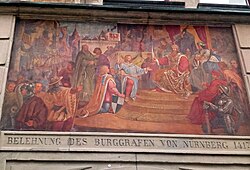 | Konstanz Haus zum Hohen Hafen, Belehnung Friedrich VI. von Hohenzollern mit der Kurmark, 1417. Fassadenmalerei, Karl von Häberlin, 1905 | Eigenes Werk | Joachim Specht | Datei:Konstanz Haus zum Hohen Hafen Kurfürst Brandenburg.jpg | |
