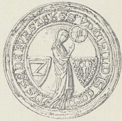 | Witwensiegel der Gräfin Udilhild von Fürstenberg, geb. von Wolfach, der Witwe des Grafen Friedrich I. von Fürstenberg | Sigmund von Riezler: Geschichte des Fürstlichen Hauses Fürstenberg und seiner Ahnen bis zum Jahre 1509. Tübingen 1883, S. 221 online bei der UB Düsseldorf | Autor/-in unbekannt Unknown author | Datei:Siegel Udilhild v Fuerstenberg.jpg |