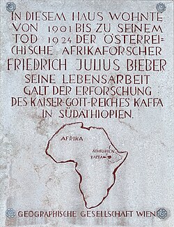 | Gedenktafel für den autodidaktischen Afrikaforscher Friedrich Julius Bieber in der Auhofstraße 144 in Hietzing. | Eigenes Werk | Herzi Pinki | Datei:Plaque for Friedrich Julius Bieber, Auhofstraße.jpg |