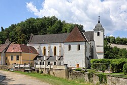 | Ostansicht der röm.-kath. Pfarrkirche bzw. der ehemaligen Kartäuserkirche in Aggsbach-Dorf, ein Ortsteil der niederösterreichischen Marktgemeinde Schönbühel-Aggsbach. Ein lang gestreckter einheitlicher Bau - geweiht 1392 - mit einem 5/8-Schluss und einem nordseitigen schlichten Turm, der nach der Klosteraufhebung Ende des 18. Jahrhunderts errichtet wurde. Im Vordergrund an die Kirche angebaut ist der Kapiteltrakt der ehemaligen Kartause. | Eigenes Werk | C.Stadler/Bwag | Datei:Aggsbach-Dorf - Kirche.JPG | |
