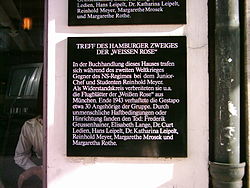 | Gedenktafel (deutsch) an der ehemaligen Buchhandlung am Gänsemarkt in Hamburg. Während es Zweiten Weltkriegs Treff des Hamburger Zweiges der Widerstandsgruppe "Weißen Rose". | Selbst fotografiert | GeorgHH | Datei:Weisse Rose Hamburg 06 Tafel de.jpg |