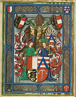 | Wappen des Salzburger Erzbischofs Friedrich Graf von Schaunberg | Missale quinque tomis constans, qui omnes multis (plus centum) et nitidissimis picturis ornati sunt (Bd. 3) - BSB Clm 15710, S.l., 15. Jh., http://daten.digitale-sammlungen.de/~db/0004/bsb00045166/images/index.html | Berthold Furtmeyr | Datei:BSB Clm 15710 Wappen Schaunberg.jpg | |