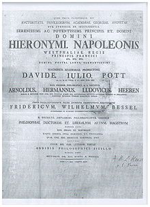 Im Jahre 1808 war Bessel als Bürger des Königreichs Westphalen wehrpflichtig und akut von der Einberufung bedroht, da er der Altersgruppe von 20 bis 25 Jahren angehörte; die tatsächlich Einzuberufenden wurden durch das Los ermittelt.[34] Bessel hatte zwar das Glück, von der Einberufung freigelost zu werden, aber schon vorher war durch Intervention von Gauß[35], Olbers[36] und Schroeter[37] eine Dispensation erwirkt worden für den Fall eines ungünstigen Auslosungsergebnisses.