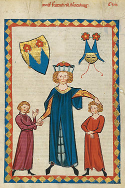 Codex Manesse , UB Heidelberg, Cod. Pal. germ. 848, fol. 407r, Friedrich von Sonnenburg | http://digi.ub.uni-heidelberg.de/diglit/cpg848/0809 | Meister des Codex Manesse | Datei:Codex Manesse Friedrich von Sonnenburg.jpg | |
