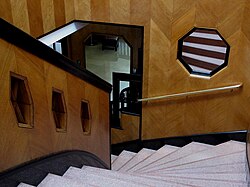 Das Gebäude besteht aus symmetrisch angeordneten, ineinander verschachtelten glatten Kuben, die durch Lisenen, Gesimse und Bay-Windows gegliedert werden. Rote Seitenteile und Rückfront und helle Vorderfront sind farblich voneinander abgesetzt. Das Flachdach wird durch eine Gitterbrüstung abgegrenzt. Das Foyer, das Stiegenhaus und der Direktionsvorraum besitzen Holzvertäfelungen und schlichte secessionistische Stuckdecken. Bemerkenswert ist der zweigeschoßige Kassensaal mit abgetreppten Maueröffnungen zu den umliegenden Räumen und einer schlicht stuckierten Balkendecke.